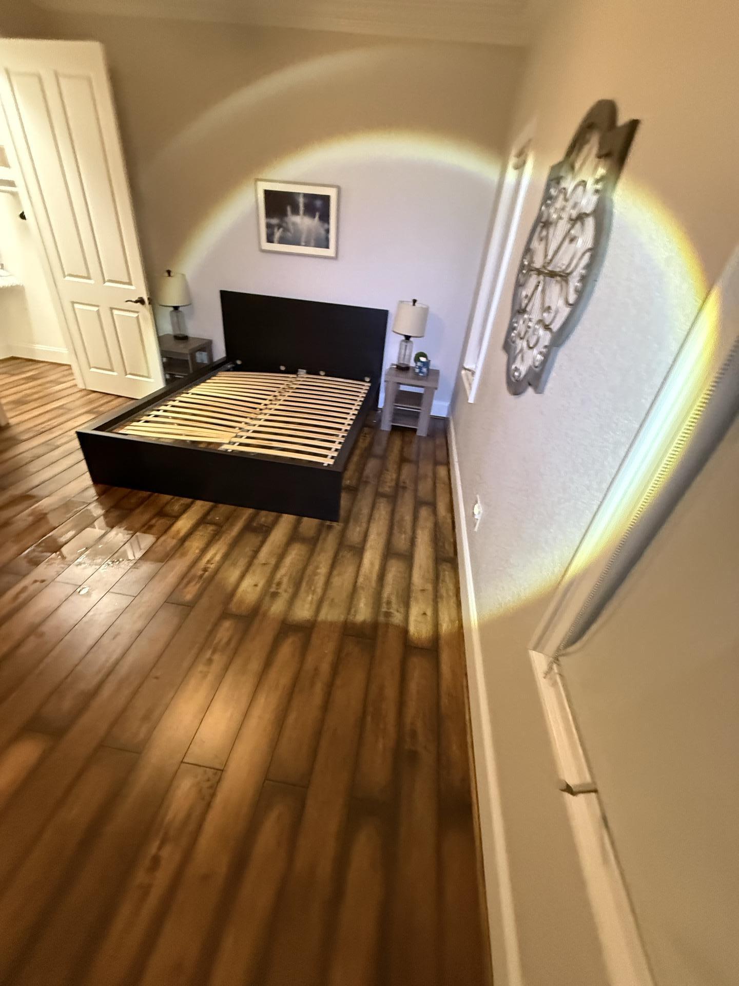 Close-up of damaged hardwood floor with water marks and debris, highlighting areas needing restoration from wind and hail.