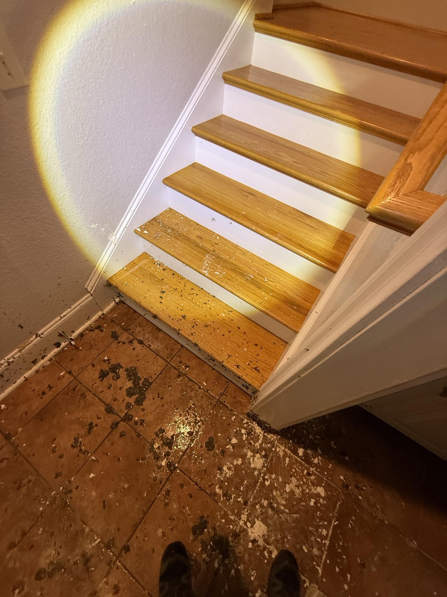 Debris scattered on tiled floor and wooden stairs near the laundry room, showing hail damage cleanup.