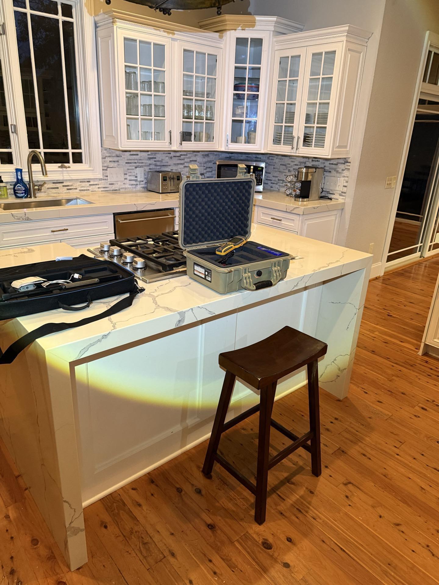 Restoration equipment on a kitchen island, indicating assessment and preparation for wind and hail damage repair.