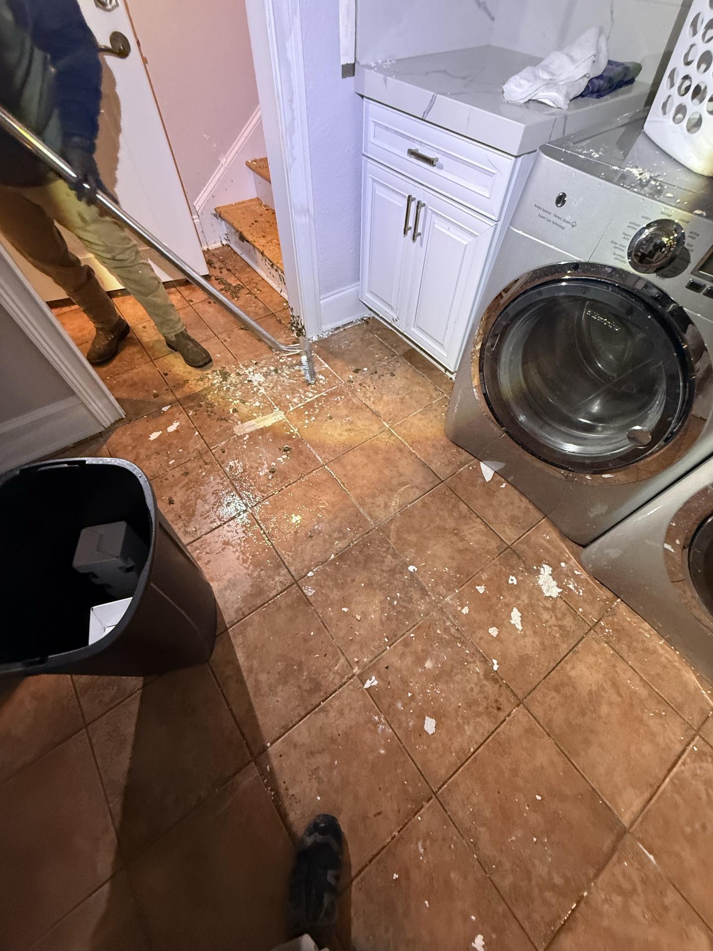 Worker removing debris from a tiled laundry room floor after hail damage, beside a washing machine.