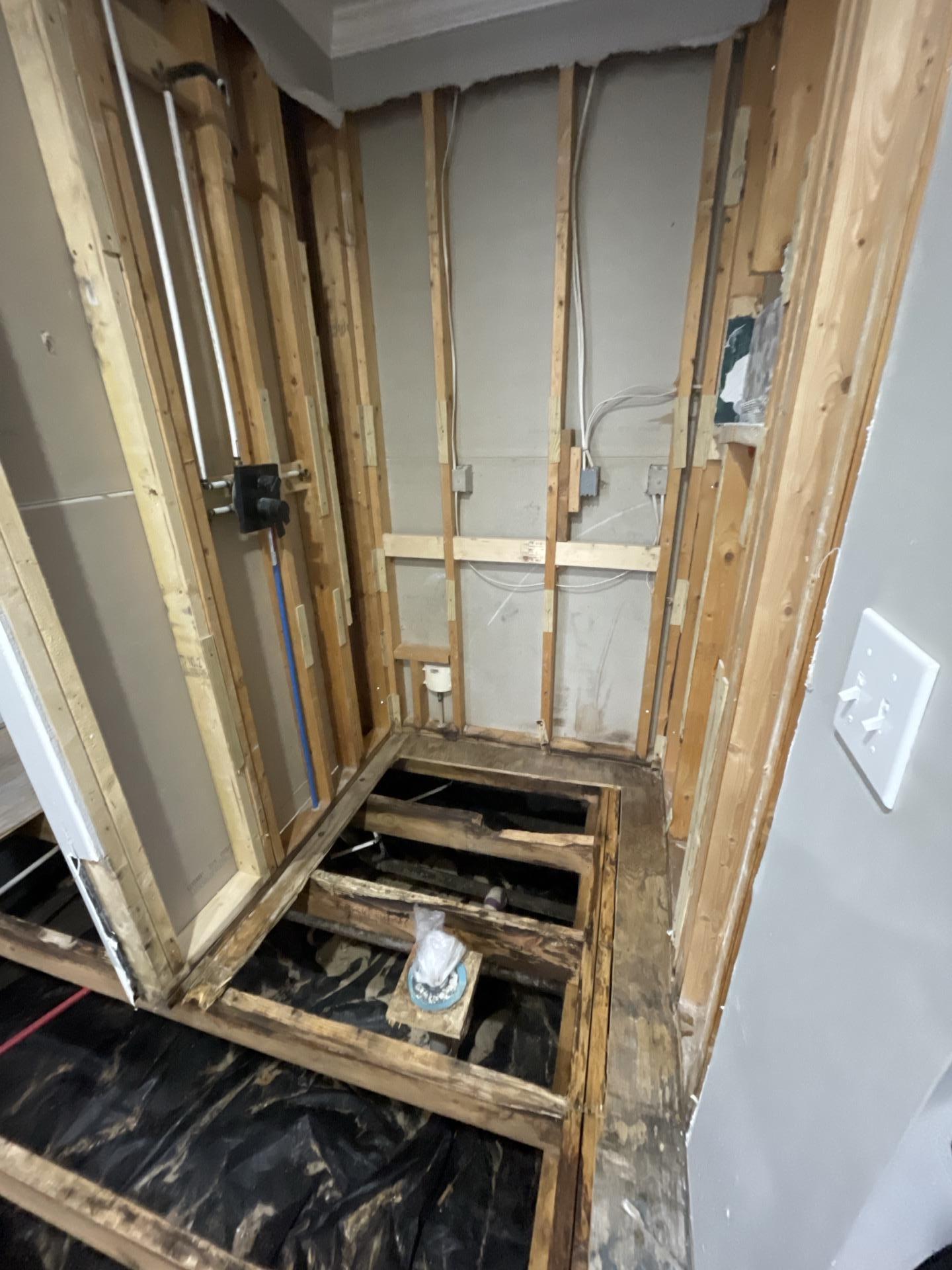 Our team conducted a thorough inspection of the water-damaged bathroom and crawl space, as evidenced by the initial assessment images. We performed water extraction, removed all compromised building materials, including water-saturated insulation and flooring, and initiated structural drying. Mold remediation protocols were implemented to address and prevent further fungal growth. Subsequent moisture readings using a Protimeter SurveyMaster confirmed that all affected areas had reached dry standards (1.0%), ensuring a complete and effective mitigation process before reconstruction.