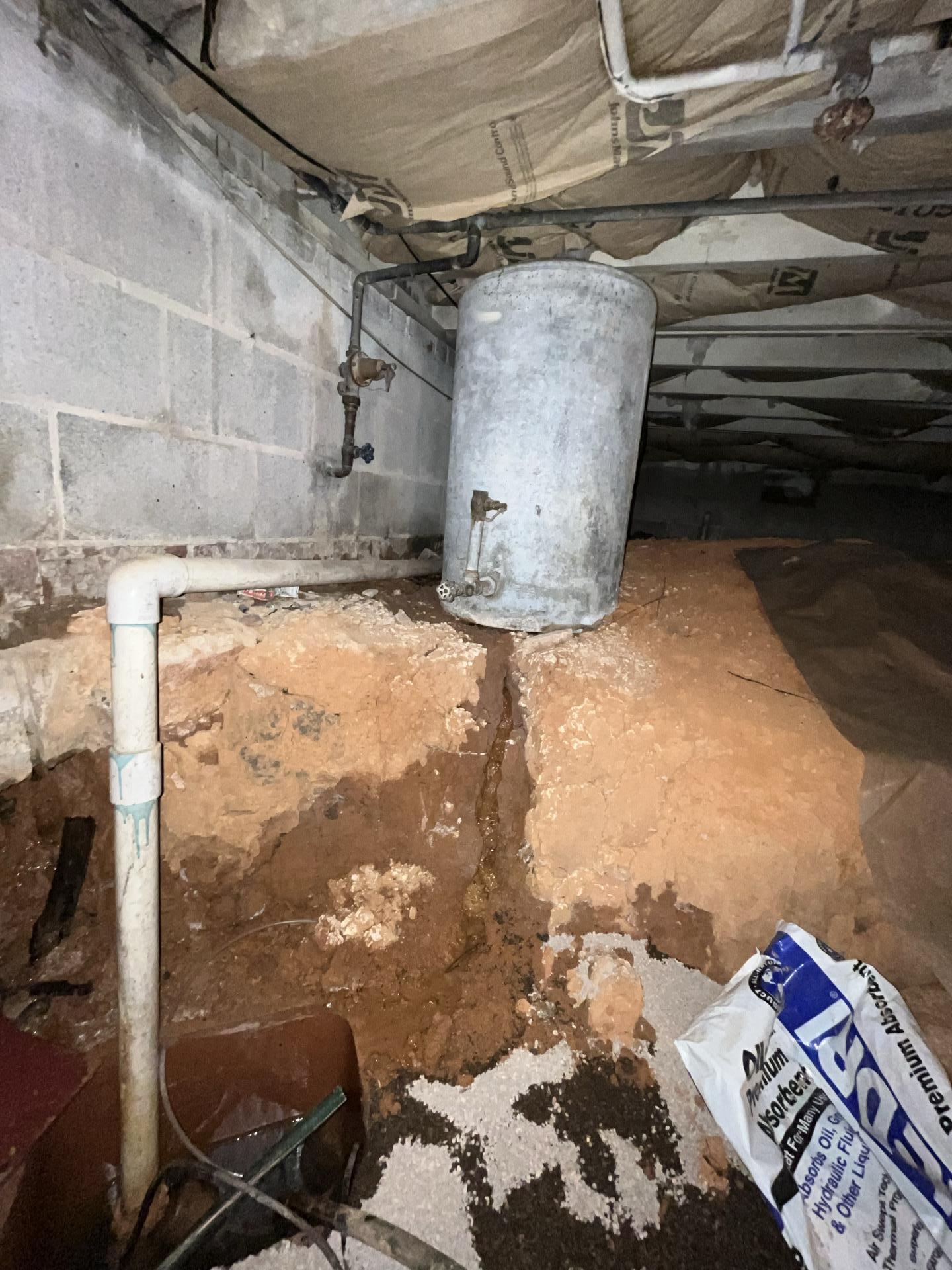 Detail of water intrusion and soil erosion in a crawl space with exposed pipes and an old tank