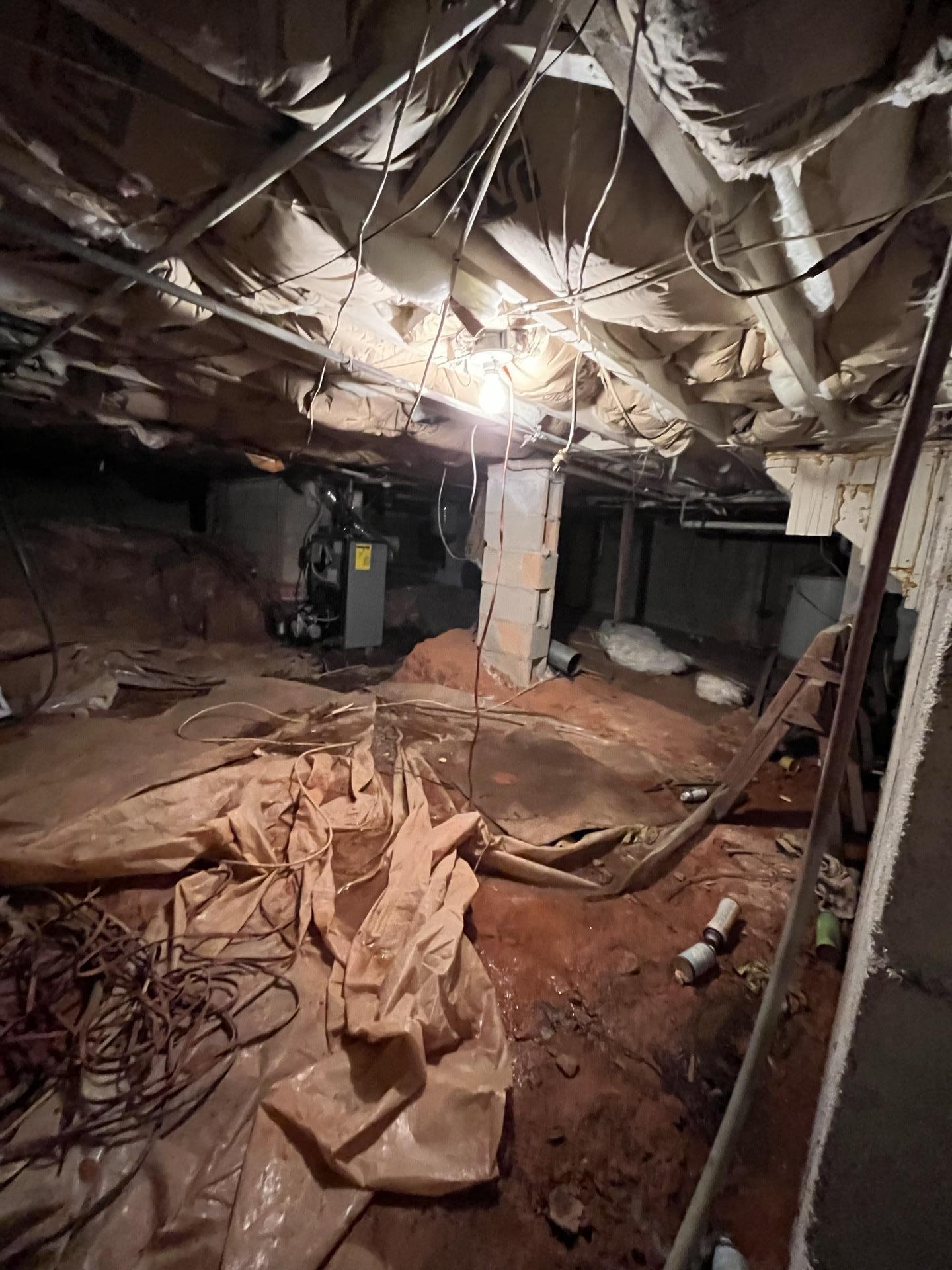 Before image of a severely flooded and damaged crawl space with debris, exposed insulation, and pipes