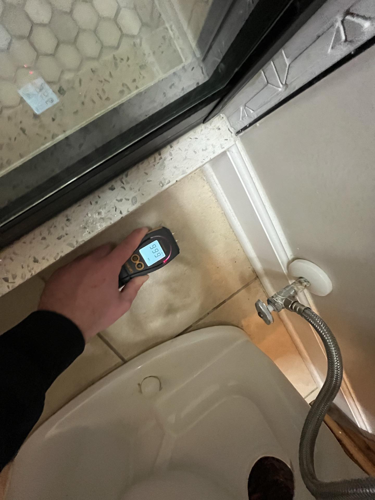 Technician using a moisture meter to detect water damage on bathroom tile floor near toilet