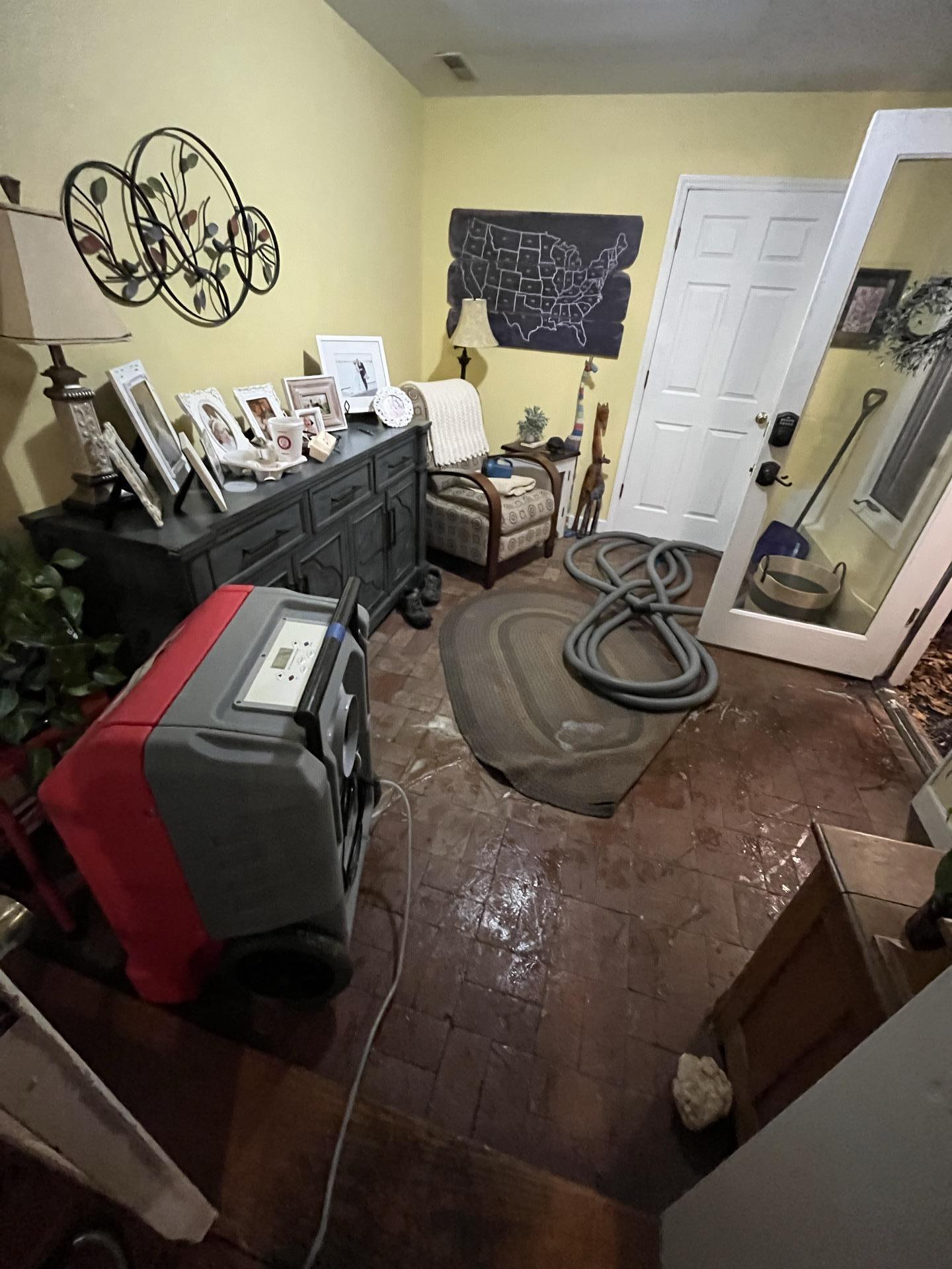 Professional water damage drying equipment in a living room with a wet rug and tiled floor during restoration