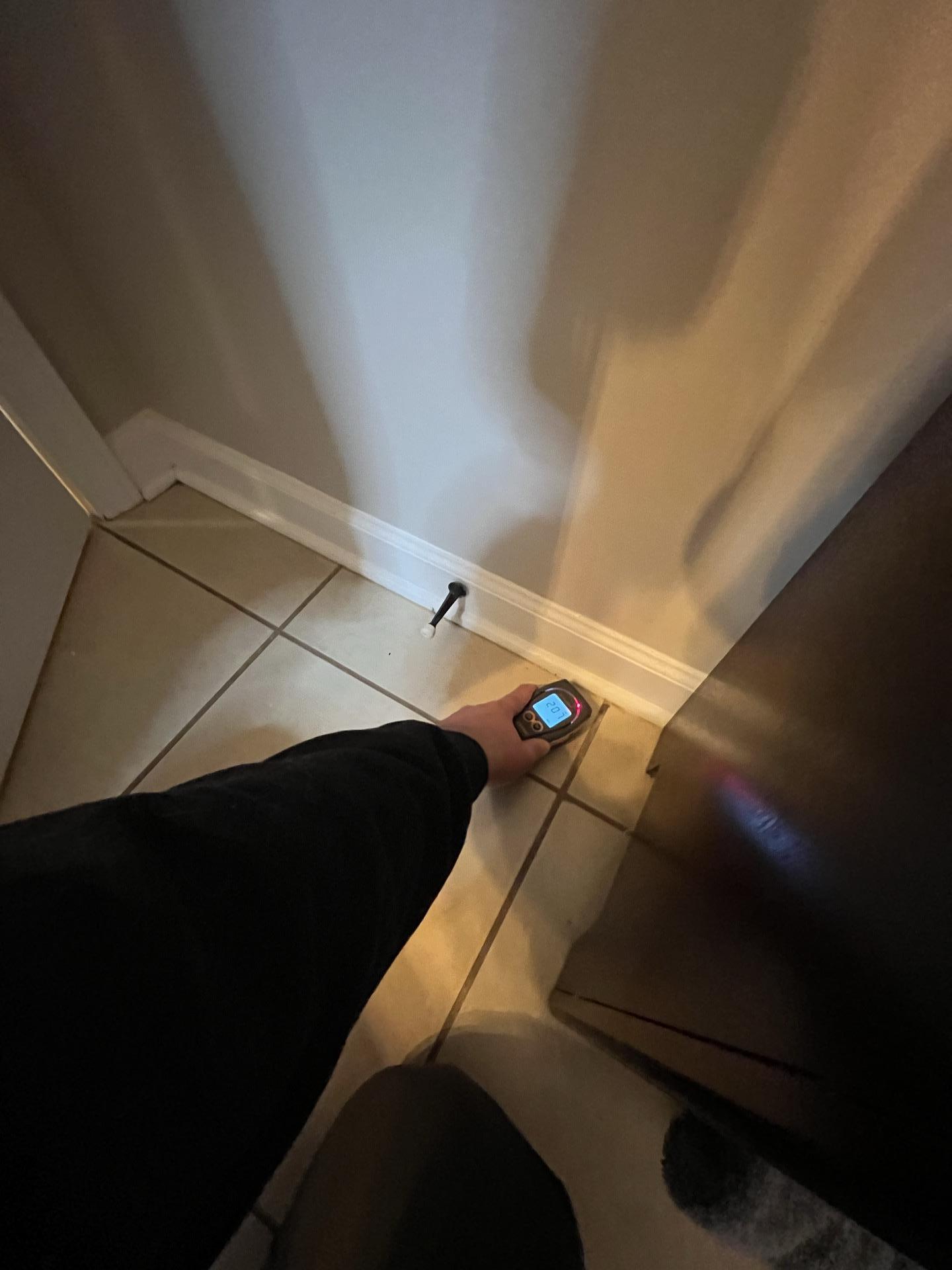 Professional checking for hidden water damage with a moisture meter along a baseboard on a tiled floor