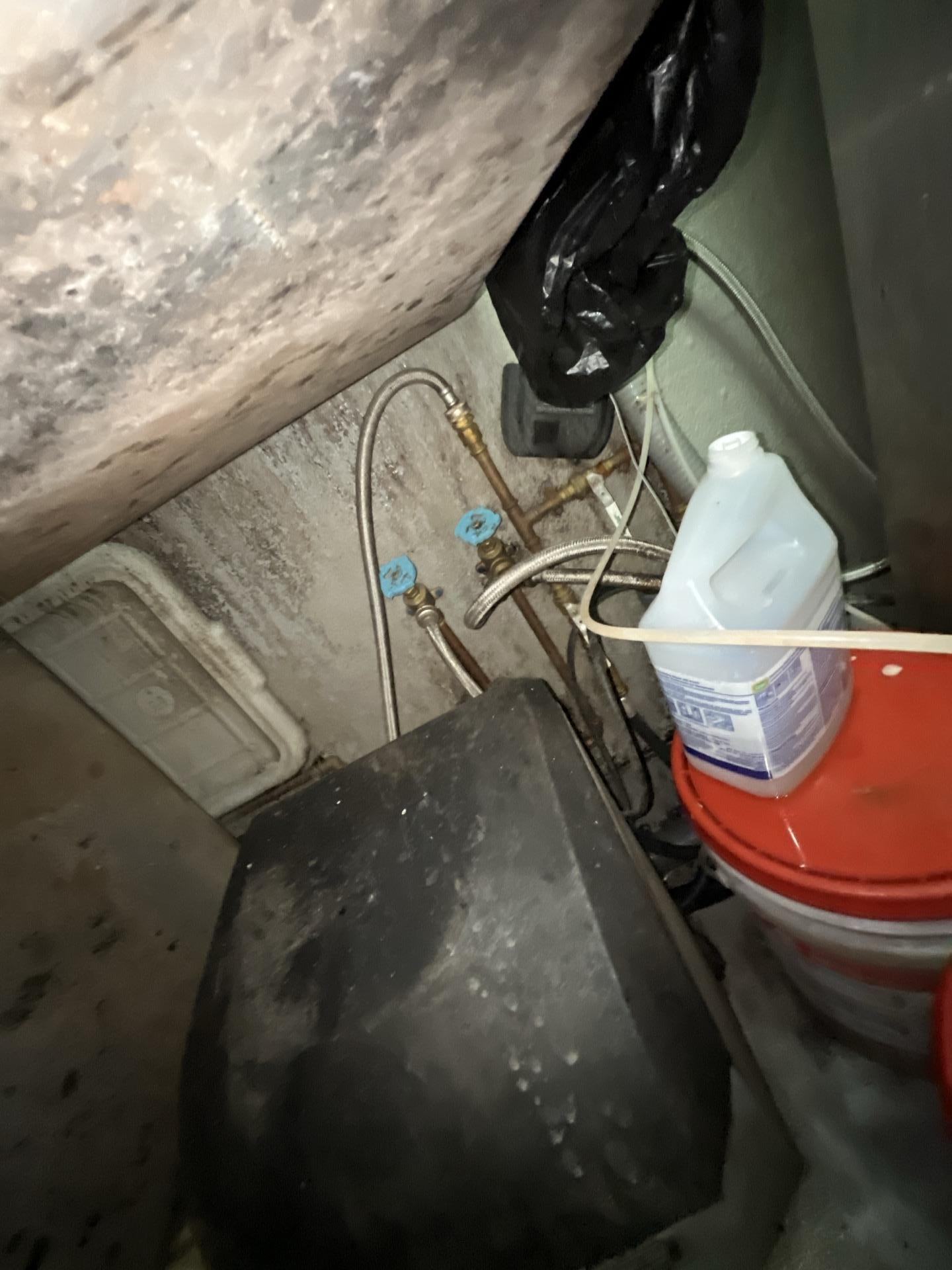 Extensive mold growth observed beneath sinks and dishwasher, extending to concrete walls, ceiling tiles, and ventilation systems due to persistent water leaks and splashing. Visible mold on ceiling tiles and suspected mold behind wall boards.