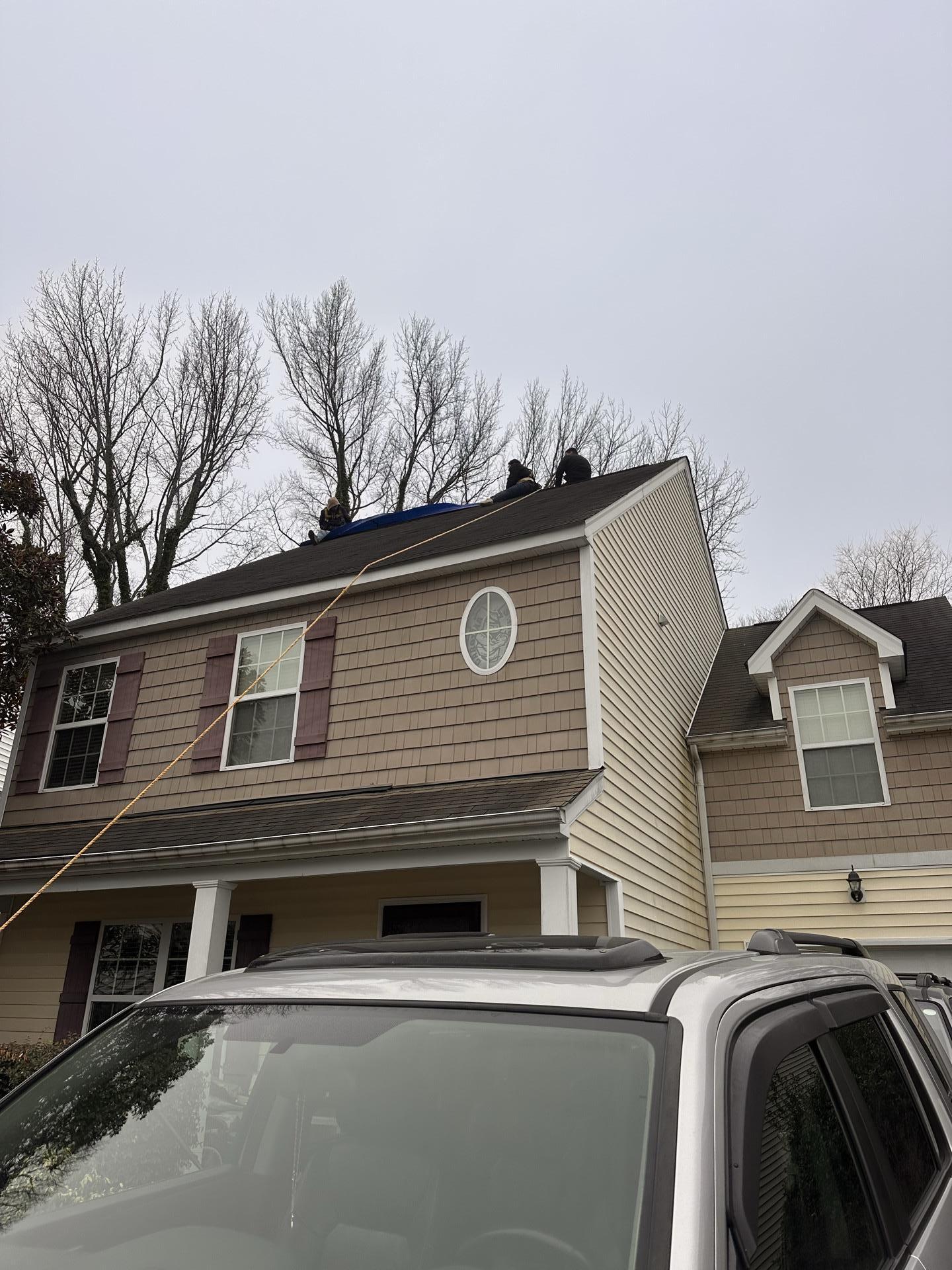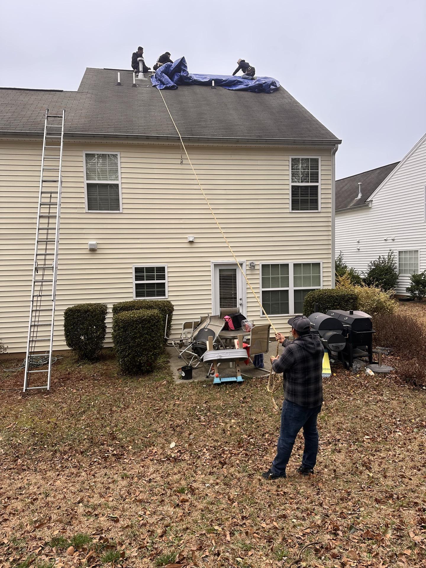 Our team promptly responded to the customer's need by installing a protective blue tarp on the damaged roof area. This temporary solution effectively sealed the compromised section, preventing additional water damage to the property.
