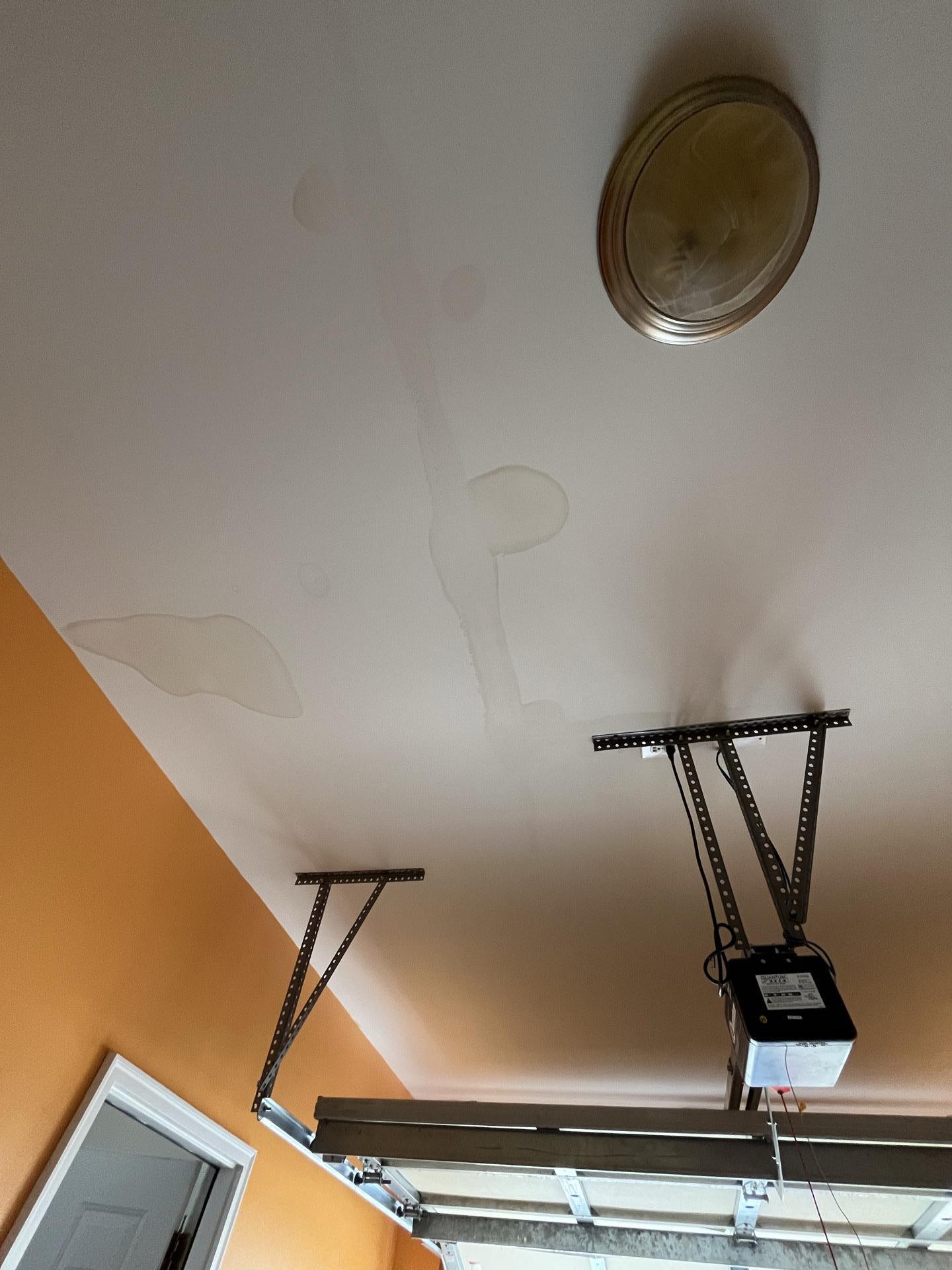 Visible water stains on a white garage ceiling, indicating recent or ongoing water damage requiring professional restoration.