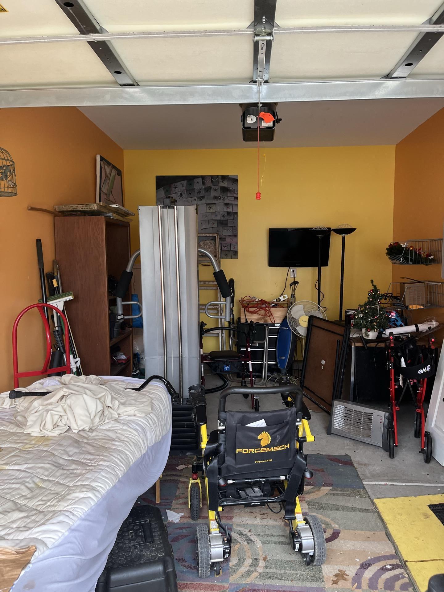 Another perspective of the cluttered garage interior, providing context for the water damage area that required restoration.