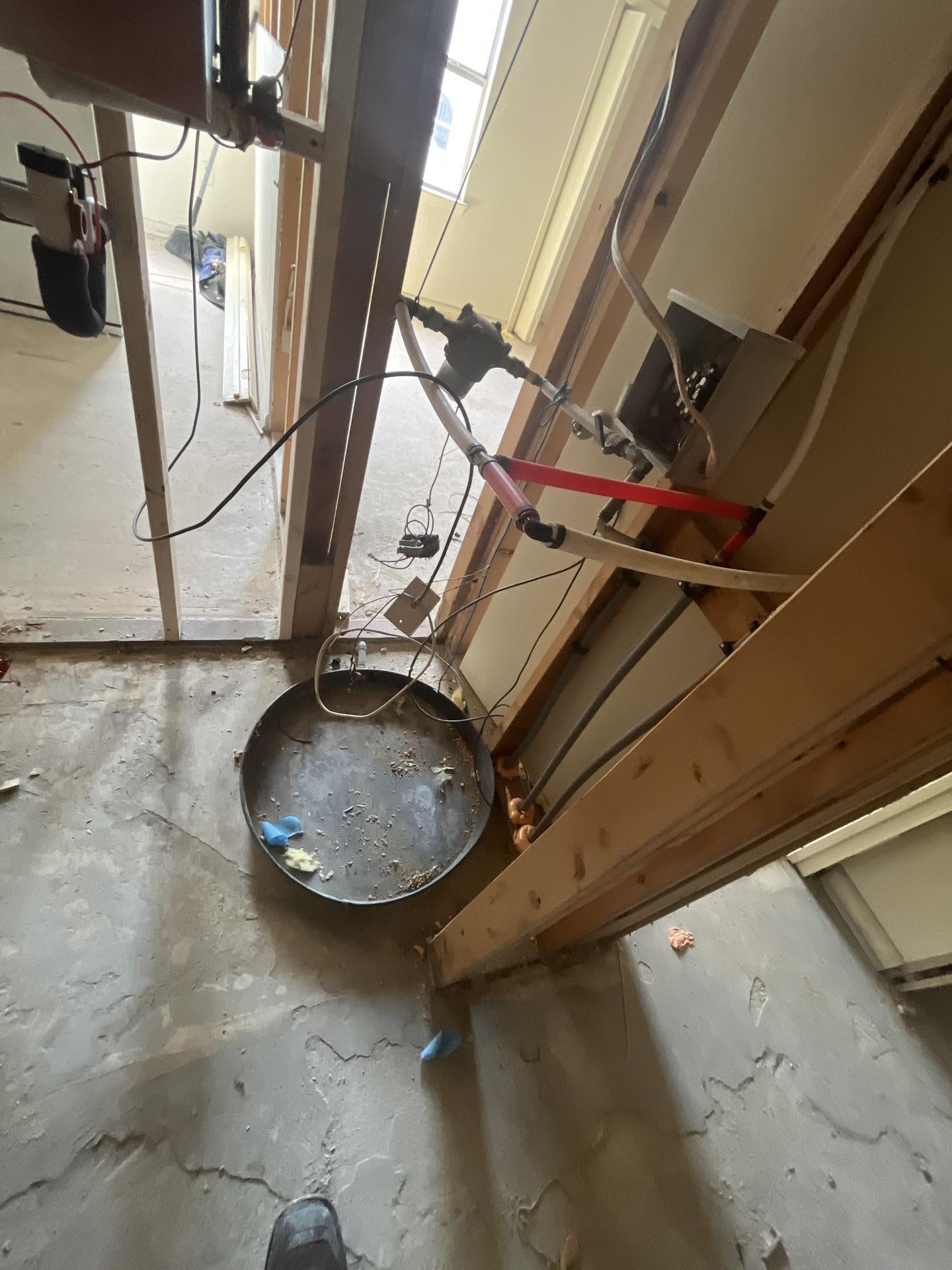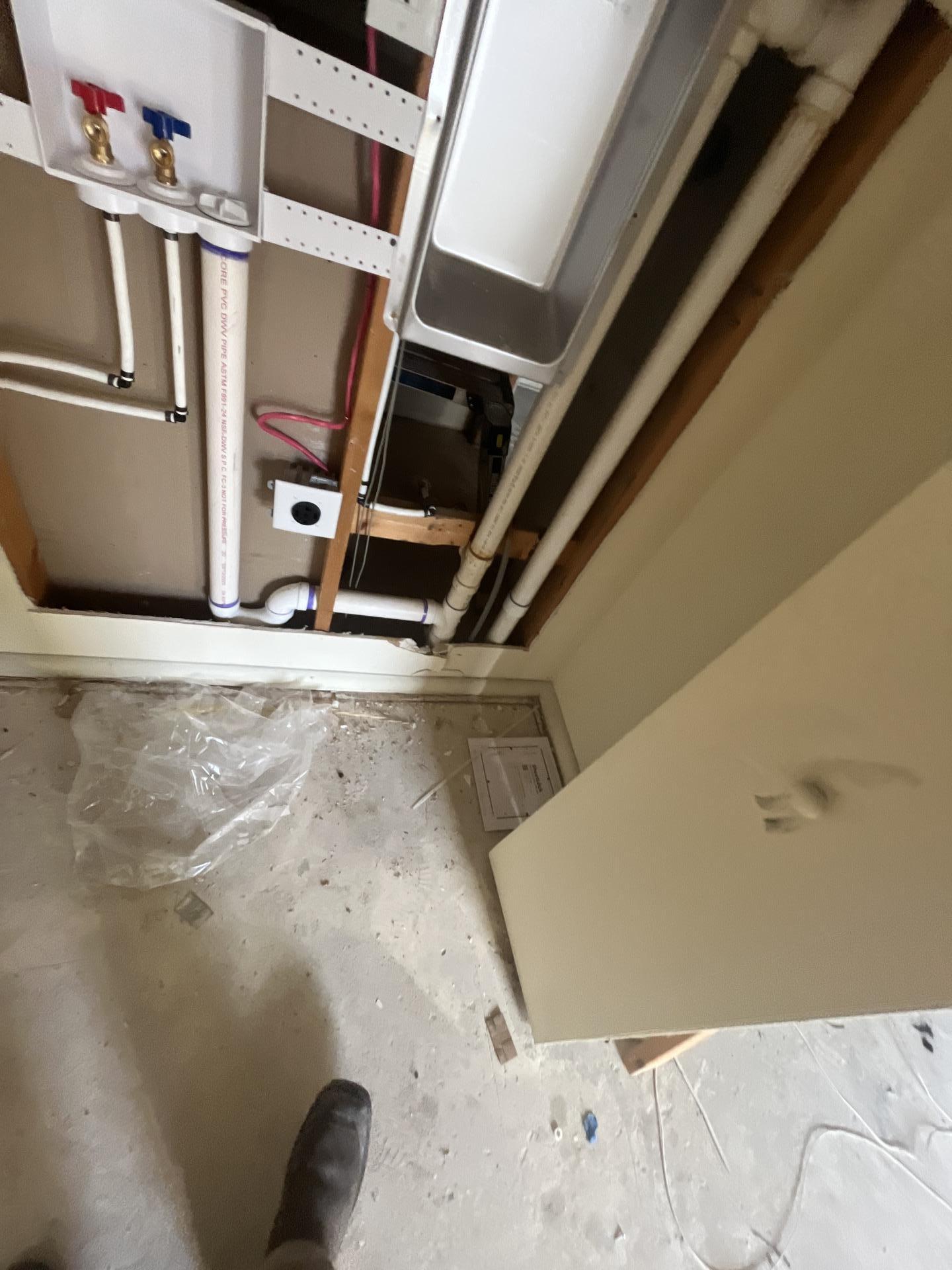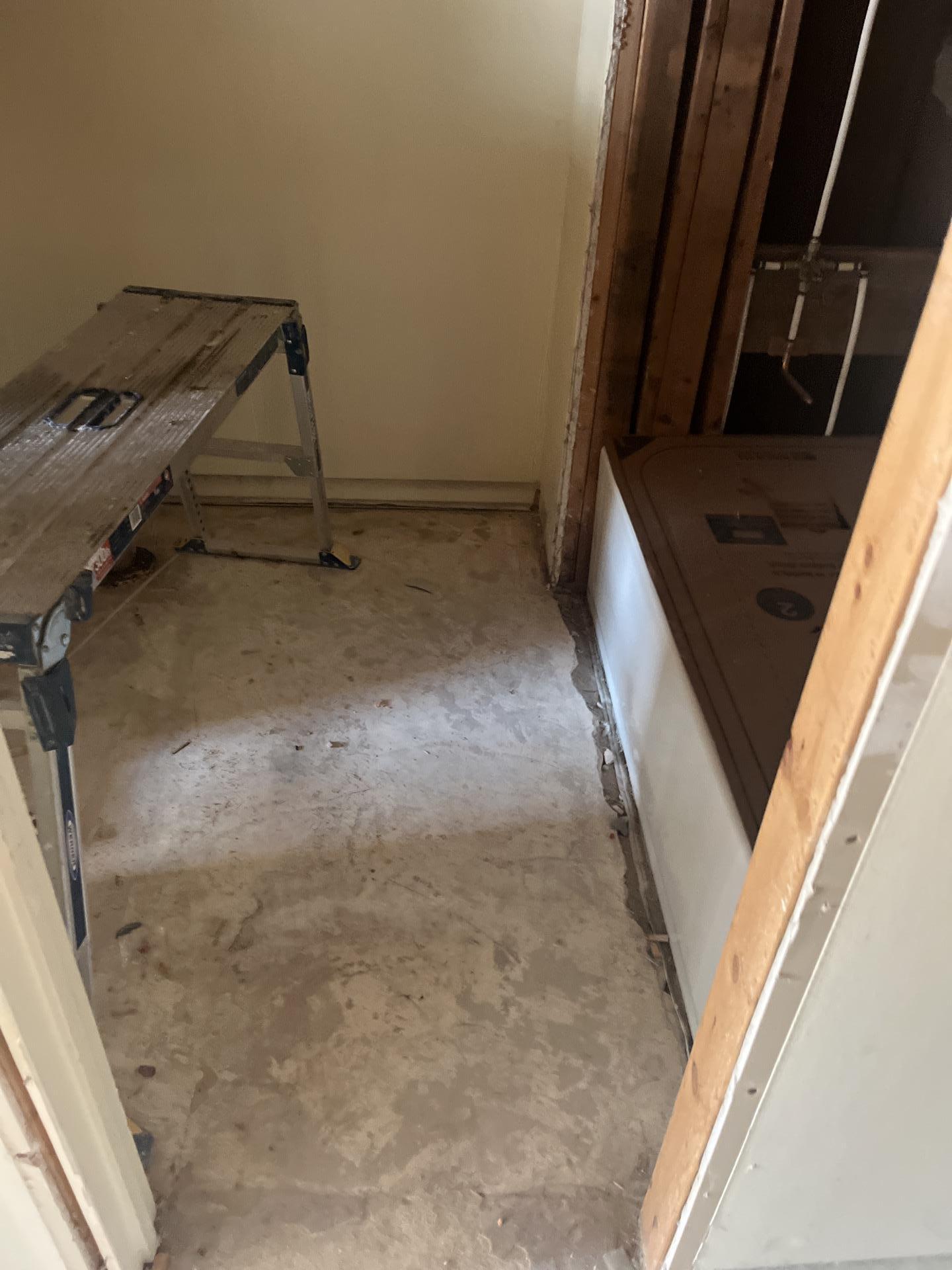 Utility area during fire damage restoration, showing exposed plumbing connections, a utility sink rough-in, and a cleared floor.