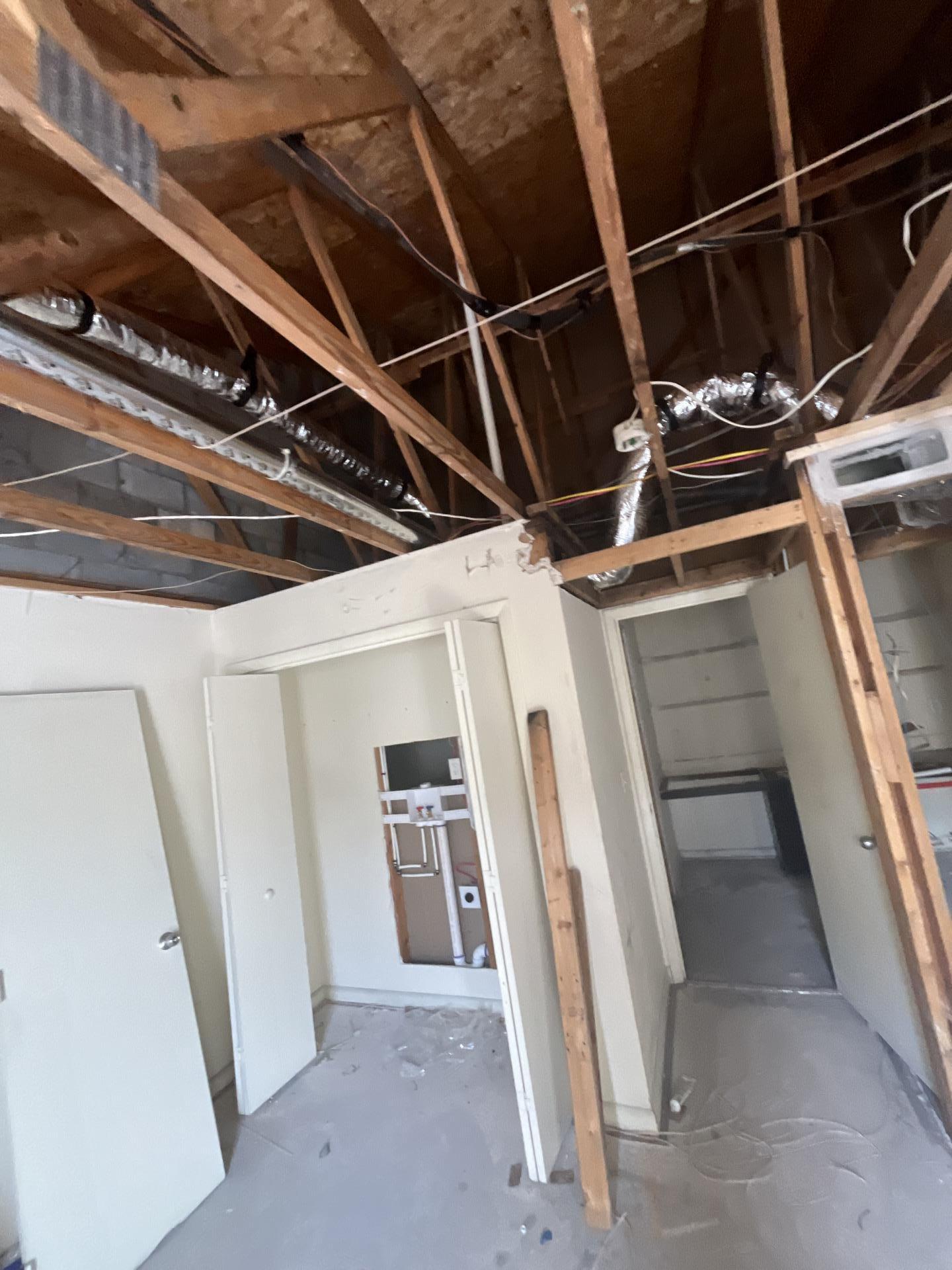 Extensive fire damage restoration with exposed attic rafters, ductwork, and partially removed walls revealing the building's internal structure.