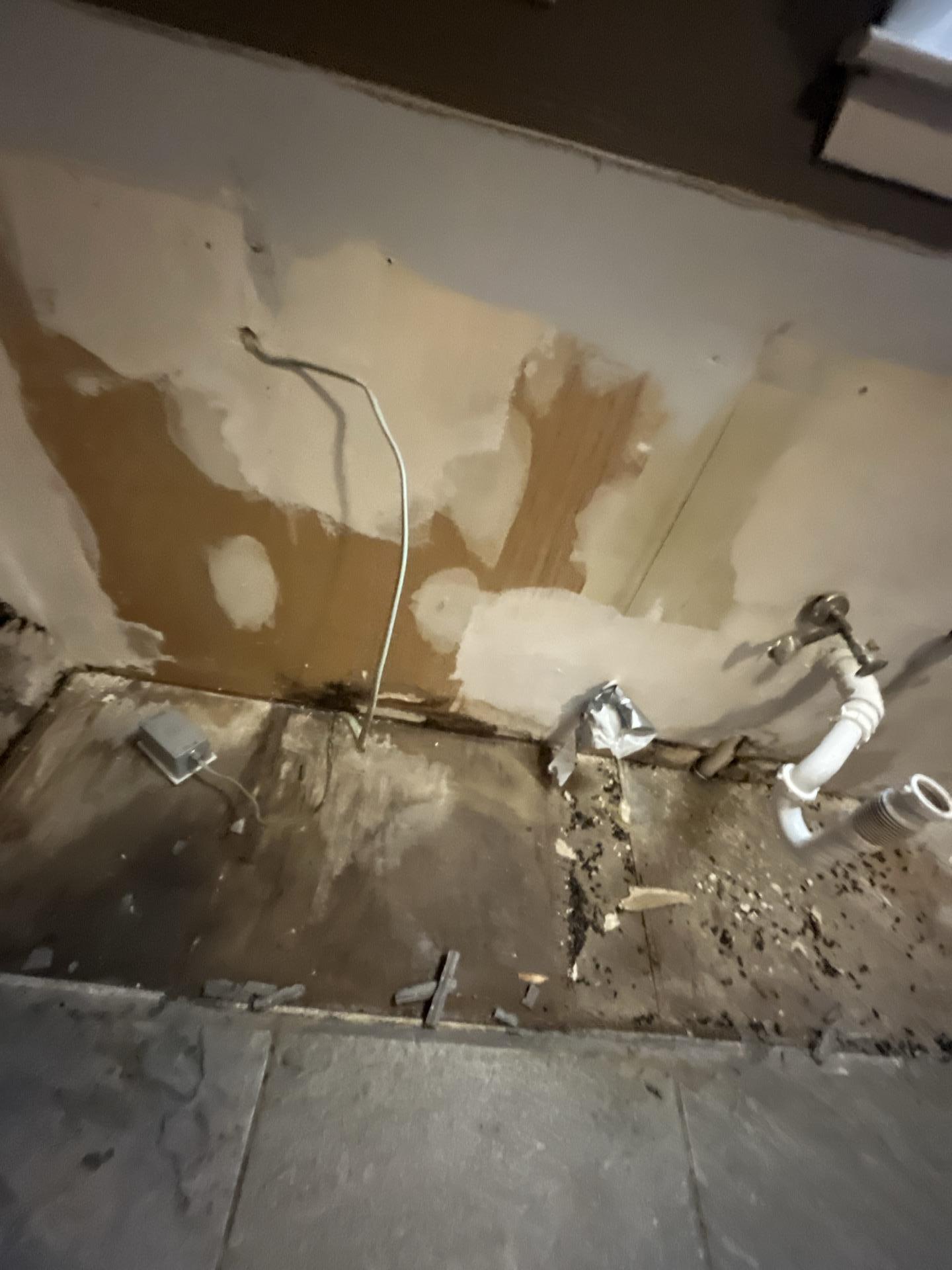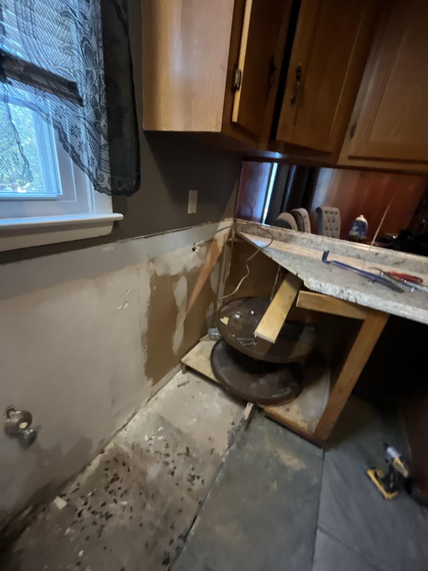 Comprehensive water damage restoration services were provided, including assessment, controlled demolition of saturated drywall and subfloor materials, professional drying to mitigate moisture, and preparation of the affected areas for reconstruction. The process involved removing damaged components from under cabinets and along walls to ensure thorough drying and remediation.