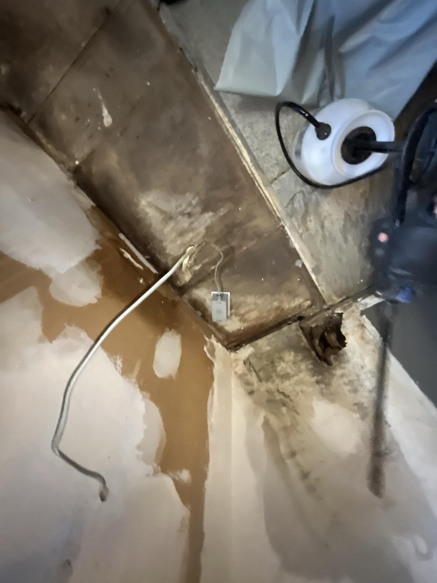 Detailed view of a heavily water-damaged corner, featuring exposed wiring, dark staining on the wall and floor, and removed drywall indicating severe moisture problems.