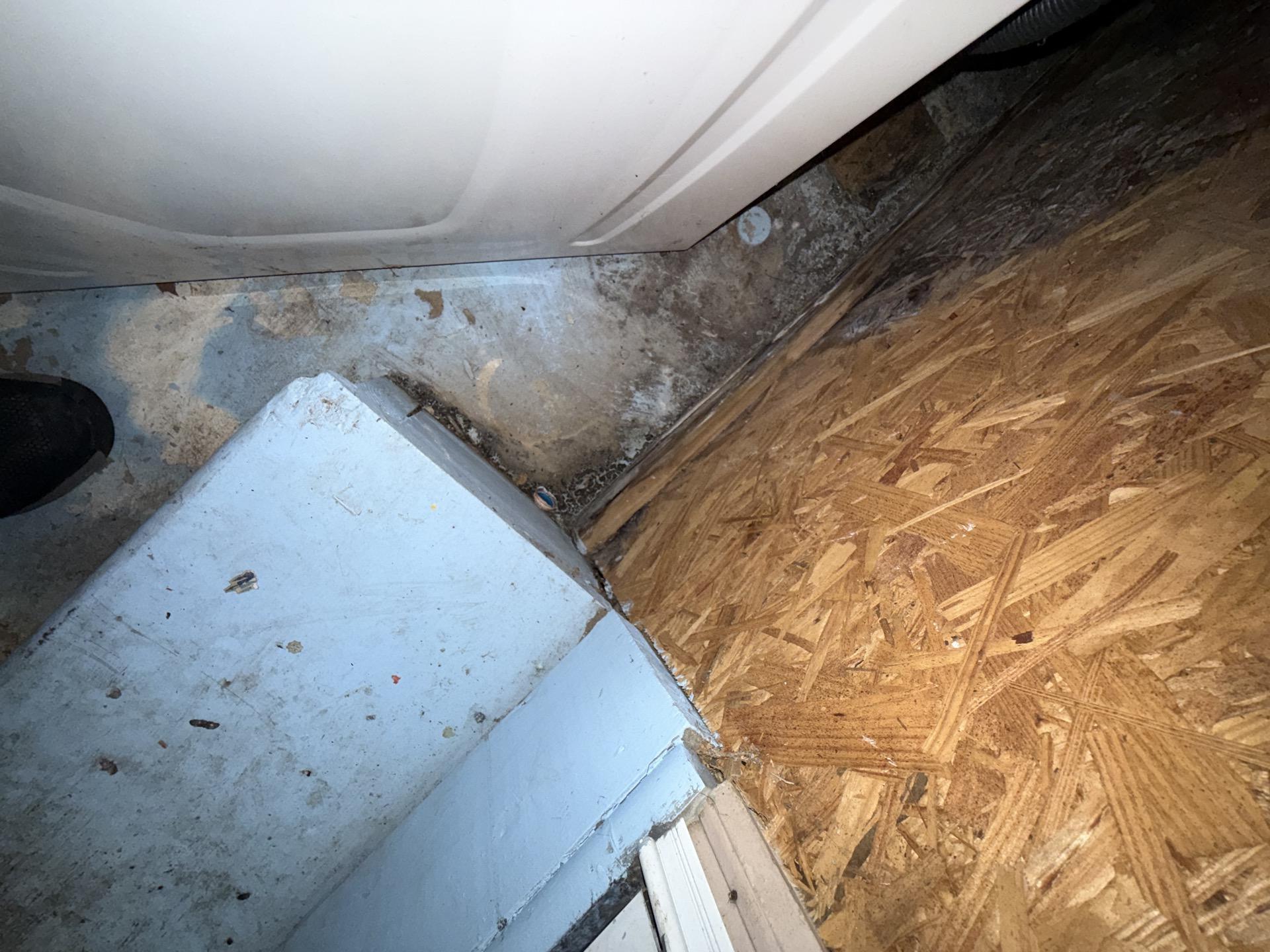 Close-up of a kitchen corner showing severely water-damaged subfloor plywood and concrete, indicating extensive moisture intrusion and potential mold.