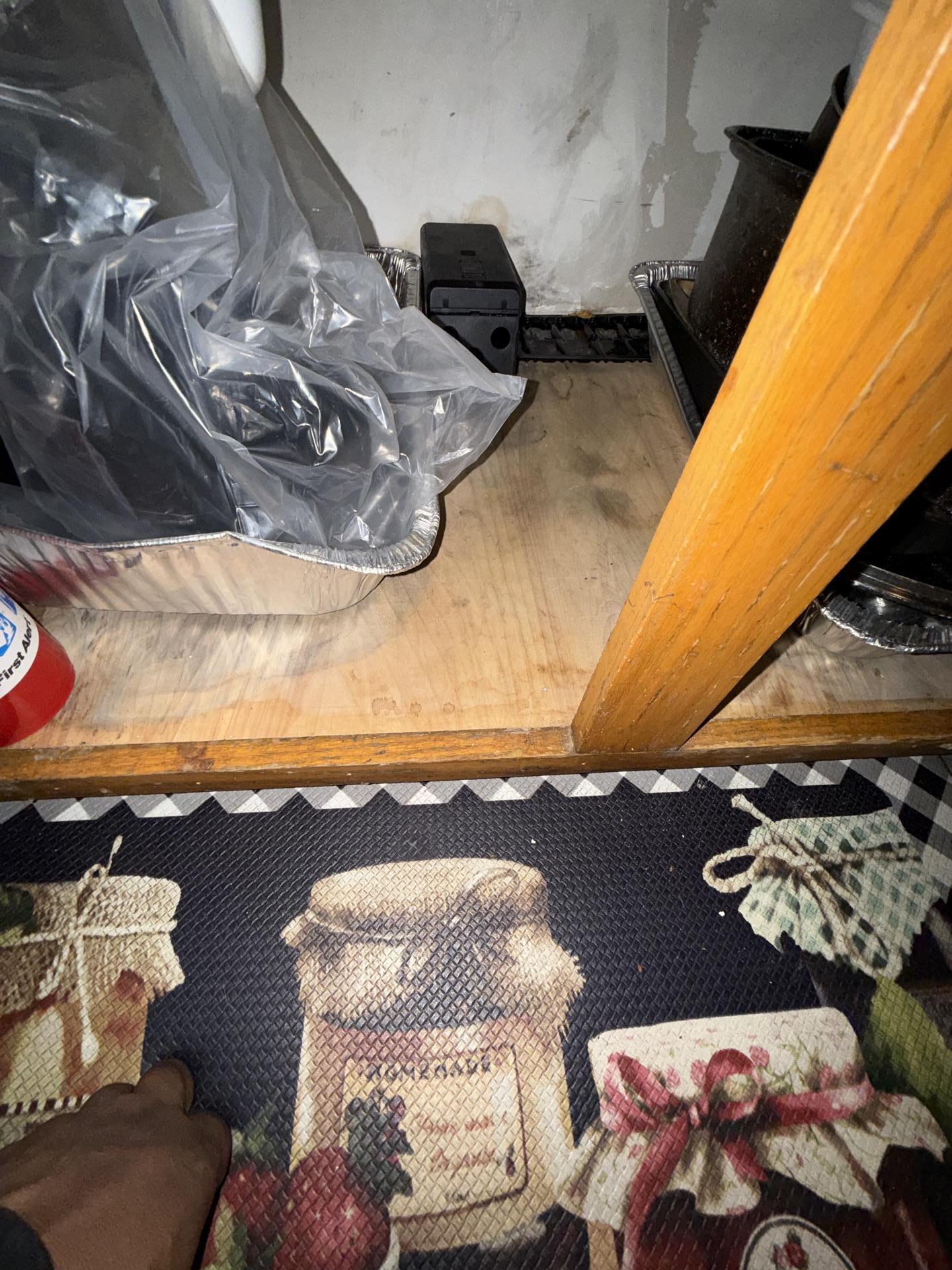 View of a kitchen floor area under a cabinet, with a decorative mat and stored items, prior to water damage assessment and restoration.