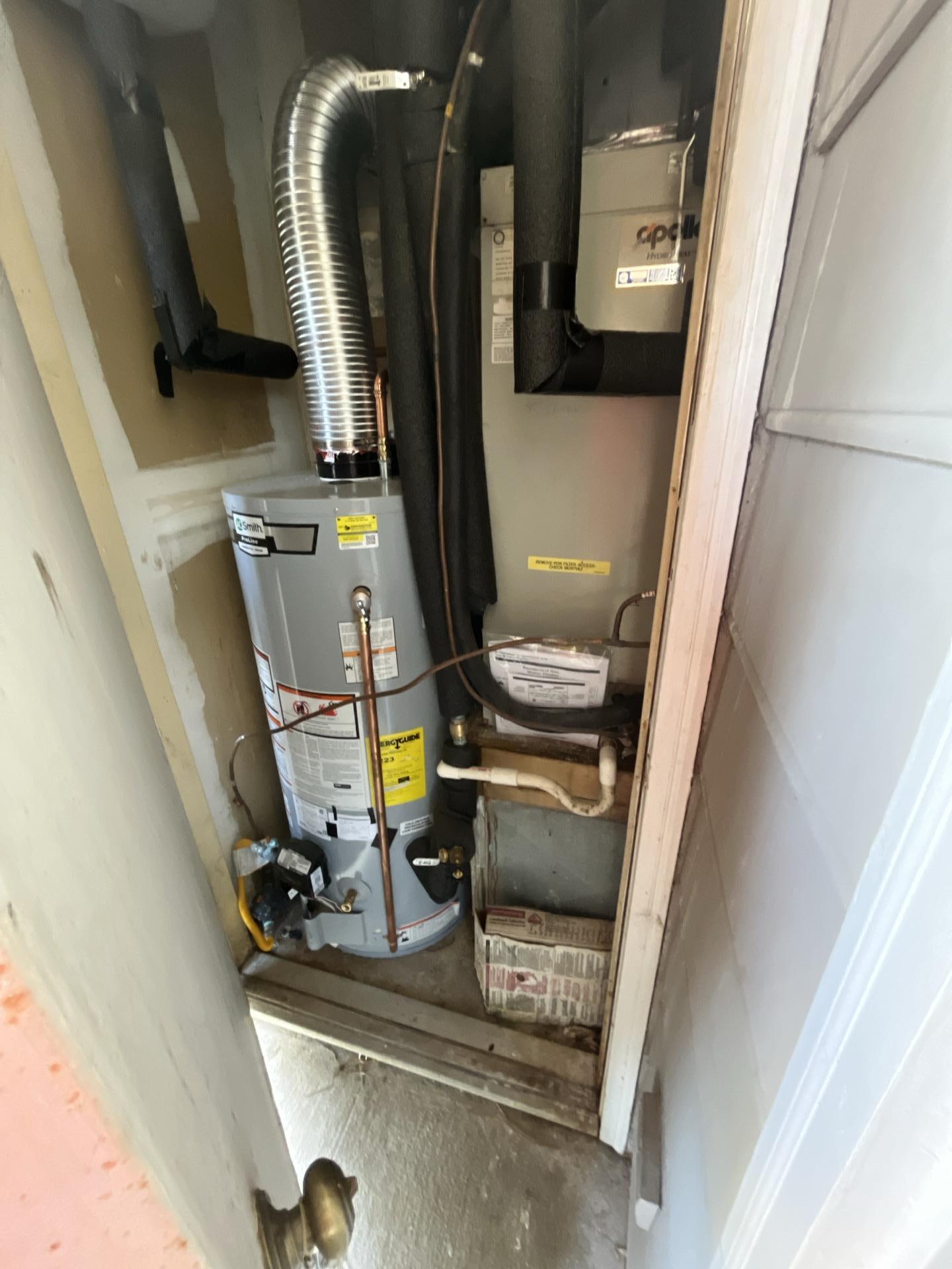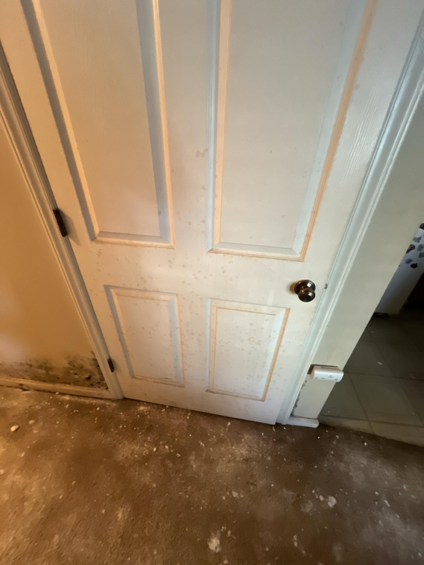 The customer experienced severe water damage in multiple areas of their property, leading to extensive moisture, visible mold growth on walls, floors, and cabinetry, and standing water in the bathroom. The damage appears to have affected common areas, kitchen, bathroom, and a utility closet housing a water heater and HVAC system.