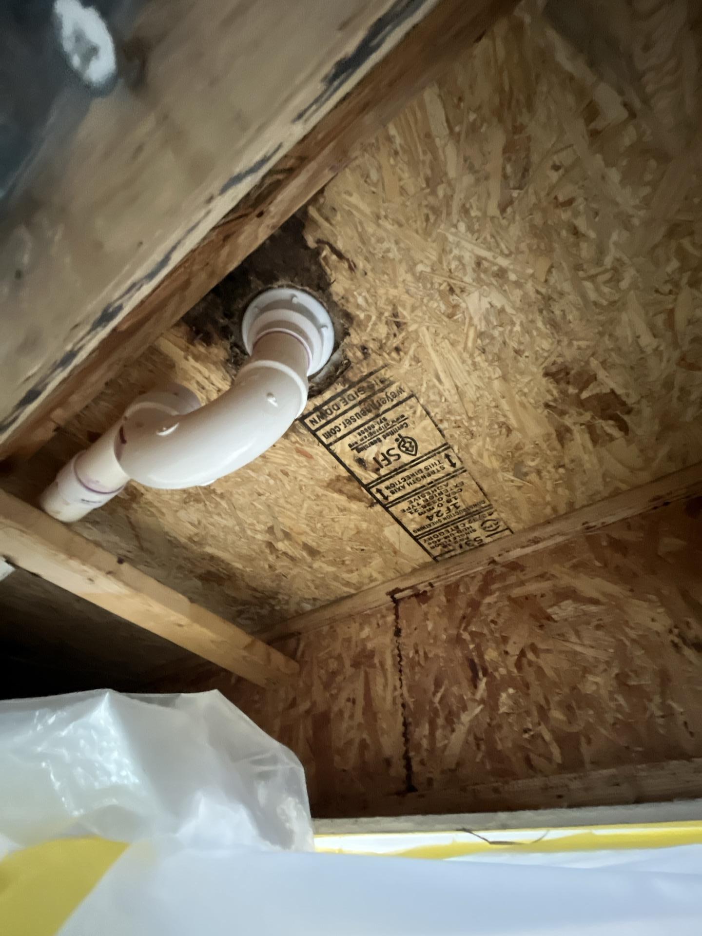The customer contacted us to address a persistent plumbing leak that had caused significant water damage to their ceiling and subflooring. The leak originated from an upper-floor bathroom drainage pipe, leading to visible water staining on the drywall, saturation of the wooden floor joists, and a risk of structural wood rot and mold development if left unmitigated.